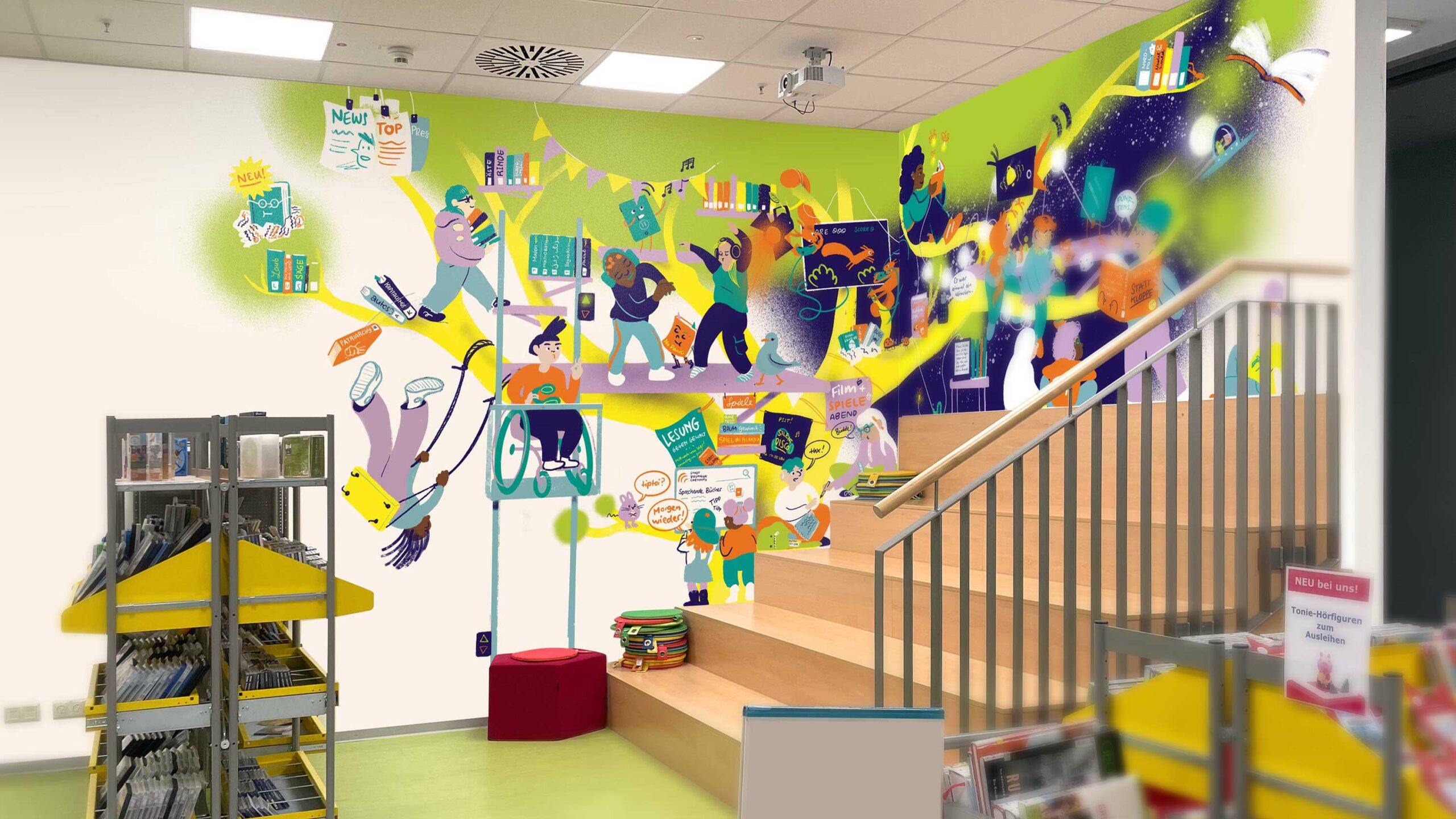 A primary mission for a city library is to be a place you love spending time in — whether you’re a kid or grown up. I was tasked with designing a vibrant tree for one of the district libraries, symbolizing everything that the Chemnitz City Library represents: multimedia offerings, unexpected parties (yes!), readings, gaming, and a commitment to inclusion and diversity.